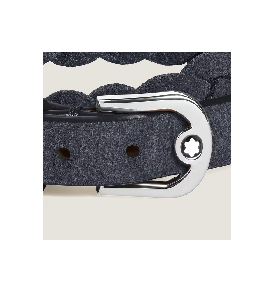 Ce bijou, tissé à partir de cuir bleu de chypre, est doté d’une boucle en acier inoxydable poli rehaussé de l'emblème Montblanc (taille 63)