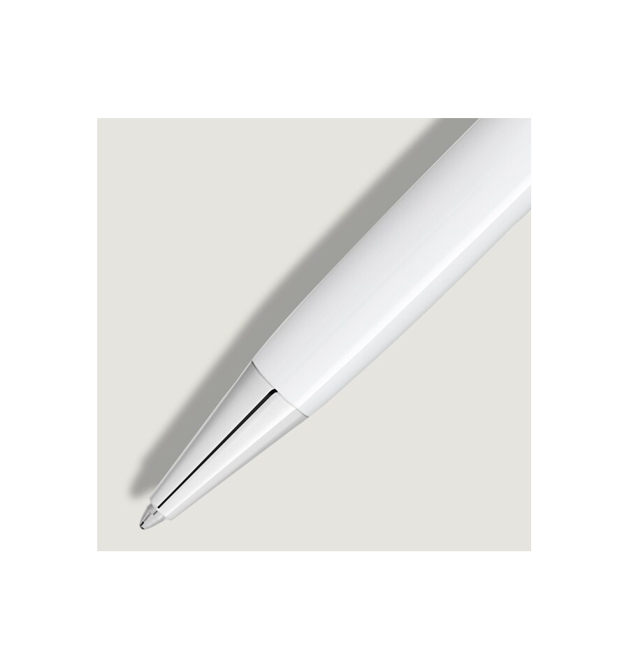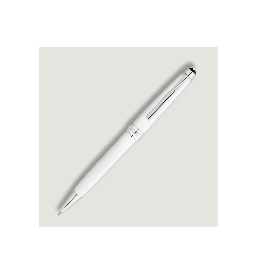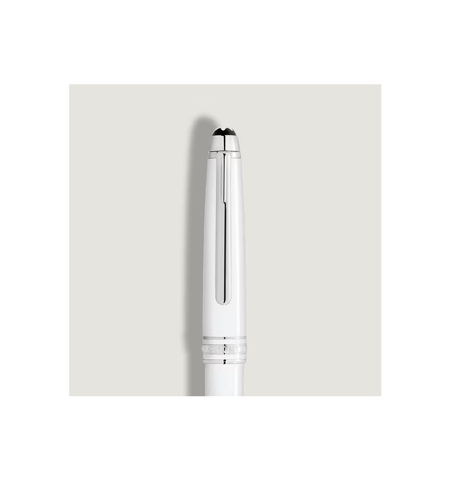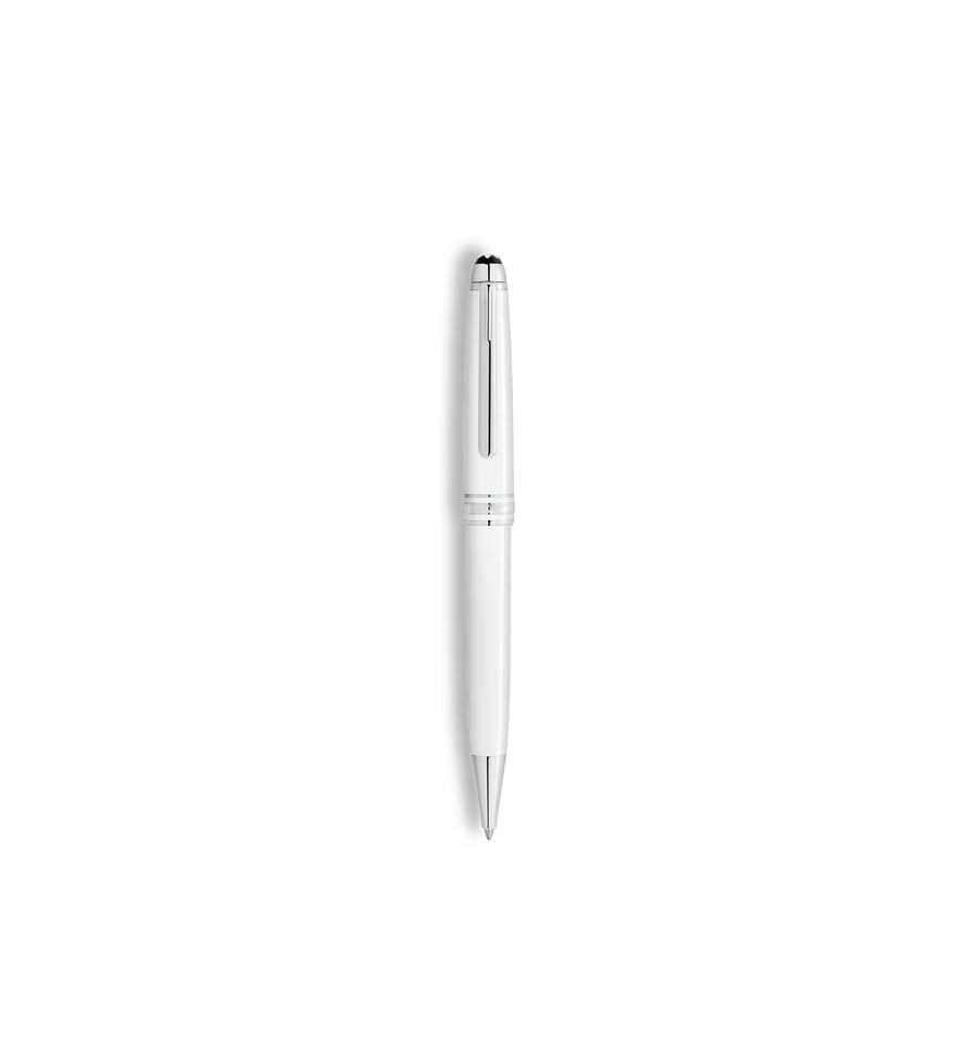 Le stylo bille Meisterstück Classique en résine précieuse blanche avec d'élégants attributs platinés, surmonté de l'emblème Montblanc blanc incrusté dans le capuchon, devient une icône du design distinctive.