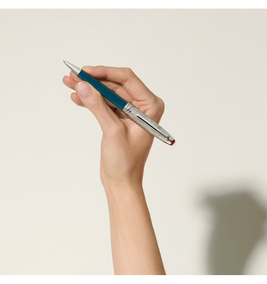 Roméo et Juliette, de William Shakespeare, sont entrés dans la postérité comme l'incarnation même de l'amour inconditionnel jusqu'à la mort. L'histoire de ces deux amants, qui périssent à cause de la rivalité entre leurs familles, reste à ce jour l'une des œuvres littéraires les plus pertinentes et les plus émouvantes jamais écrites. La collection Montblanc Meisterstück Roméo et Juliette est dédiée à ce monument de la littérature mondiale. Dédié à Roméo, le corps du stylo bille Doué Midsize est façonné dans une résine précieuse couleur bleu sarcelle afin d'évoquer l'aura céleste du jardin. Sur le capuchon platiné, une rose délicate est représentée au milieu d'un motif de feuilles finement ouvragé. Elle symbolise l'espoir ardent de Juliette que leur amour restera intact malgré leur héritage familial, tout comme le parfum pur et envoûtant d'une rose qui dure éternellement.
