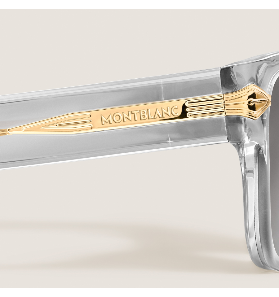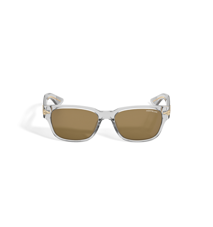 Ces lunettes de soleil carrées possèdent une monture grise en acétate et des verres marron. Inspirée de la forme de la plume sur les instruments d’écriture, une petite plume vient orner les branches en métal. Le logo Montblanc à une ligne est gravé sur le côté droit des branches, et le logo est également gravé au laser sur le verre gauche.