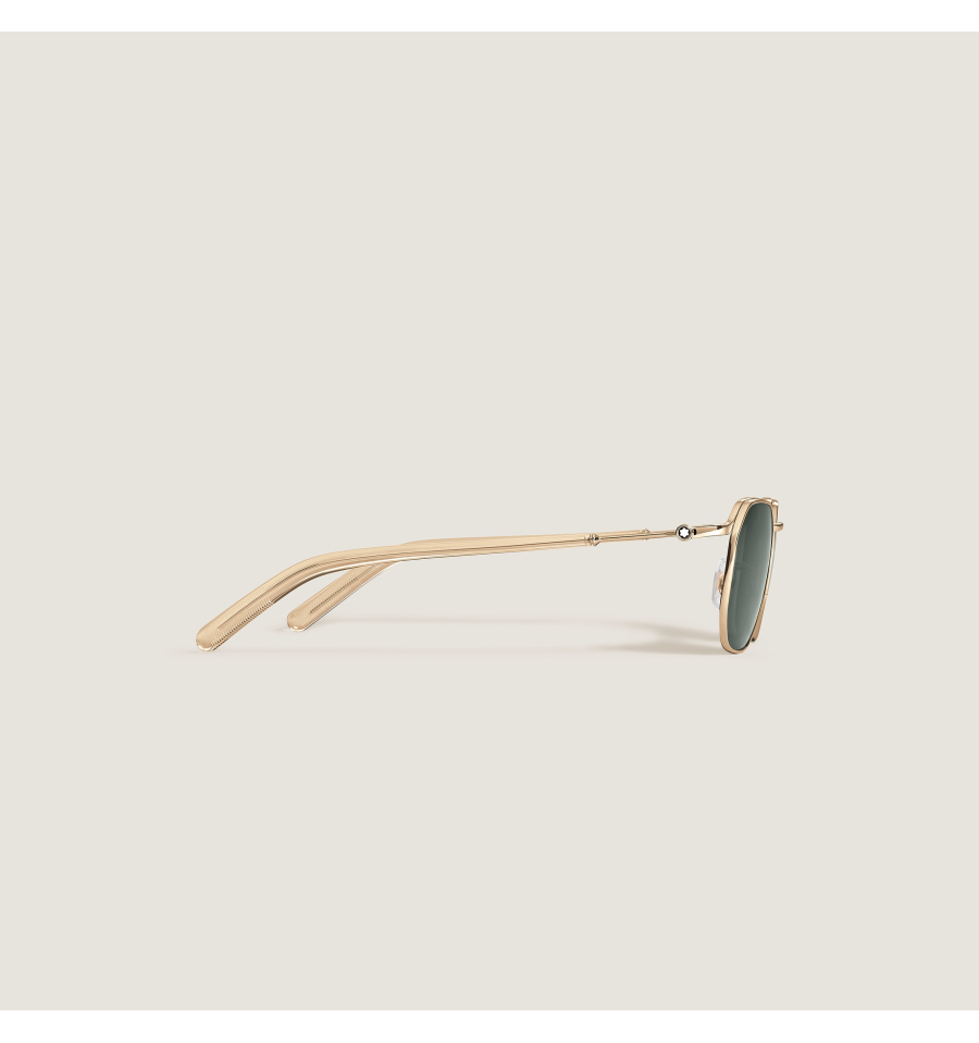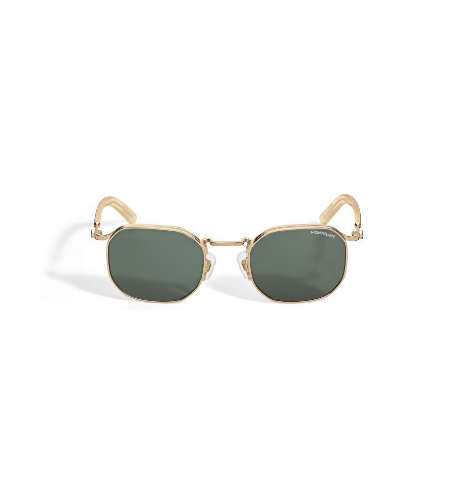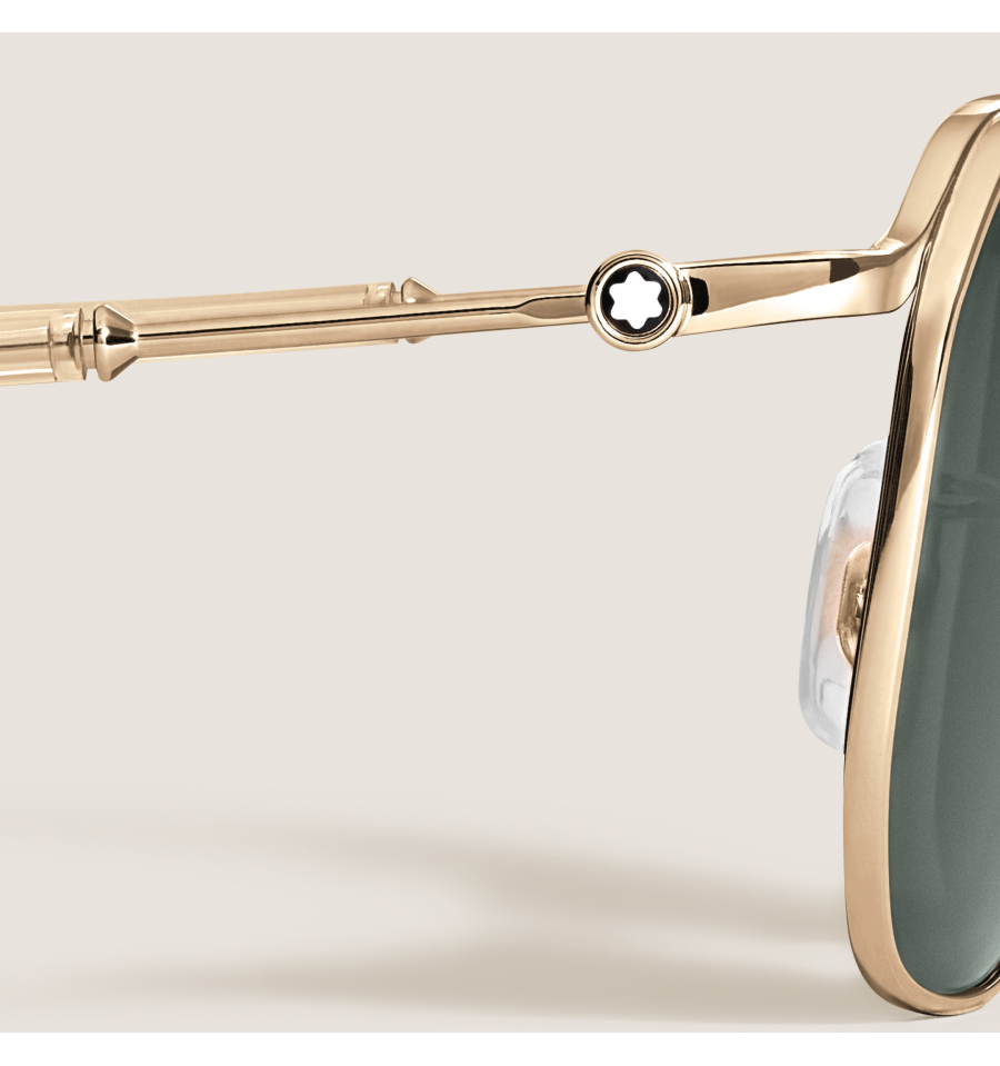 Ces lunettes de soleil carrées possèdent une monture métallique dorée et des verres verts. L’emblème Montblanc est dissimulé dans la branche. Le logo Montblanc est gravé au laser sur le verre gauche des lunettes et le motif antidérapant gravé au laser sur la partie interne des extrémités des branches assure une tenue confortable.