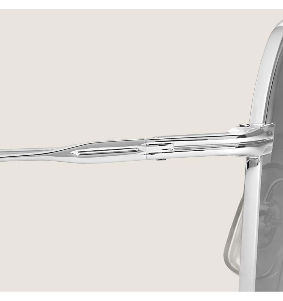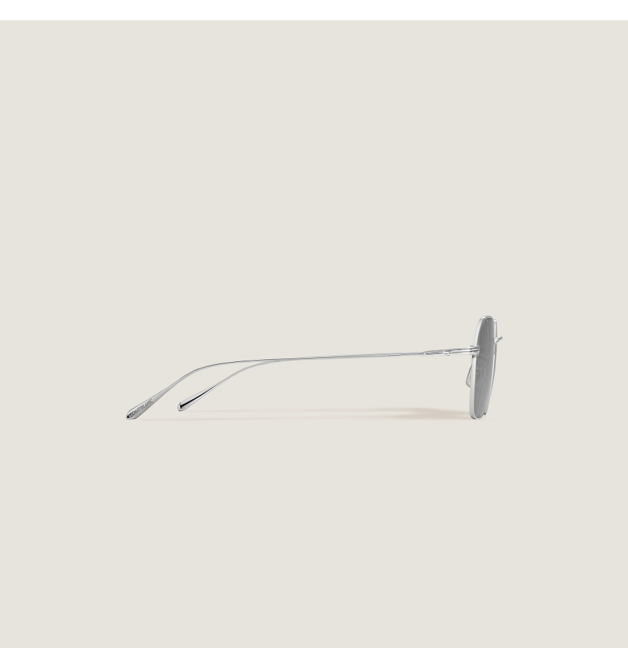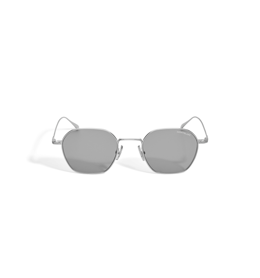 Ces lunettes de soleil rondes possèdent une monture métallique argentée et des verres gris. Inspirée de la forme de la plume sur les instruments d’écriture, une petite plume vient orner les branches en métal. Le logo Montblanc à une ligne est gravé sur le côté droit des branches, et le logo est également gravé au laser sur le verre gauche.