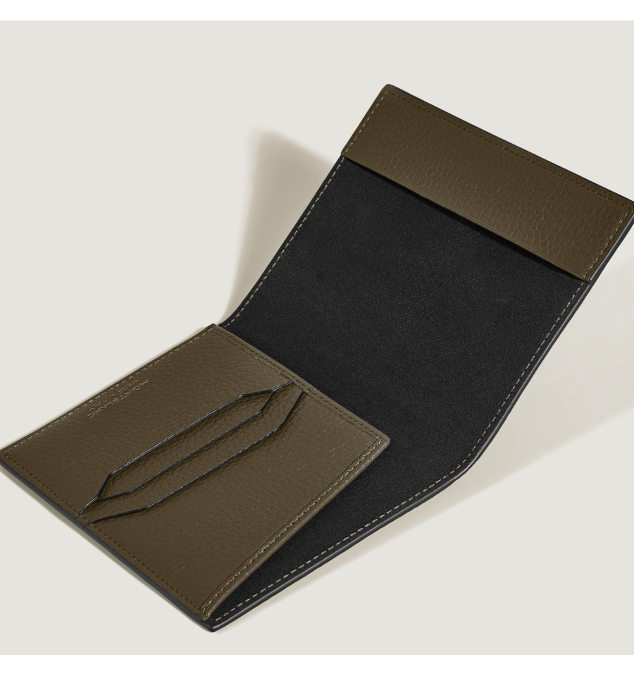 Fabriqué en cuir de veau de première qualité de couleur kaki, ce porte-passeport est le compagnon de voyage idéal pour les voyages d'affaires ou les escapades du week-end. Conçu pour s'adapter à tous les passeports internationaux, il est doté d'une poche ouverte pour un accès facile et d'une petite poche supplémentaire pour contenir en toute sécurité le talon de la carte d'embarquement.