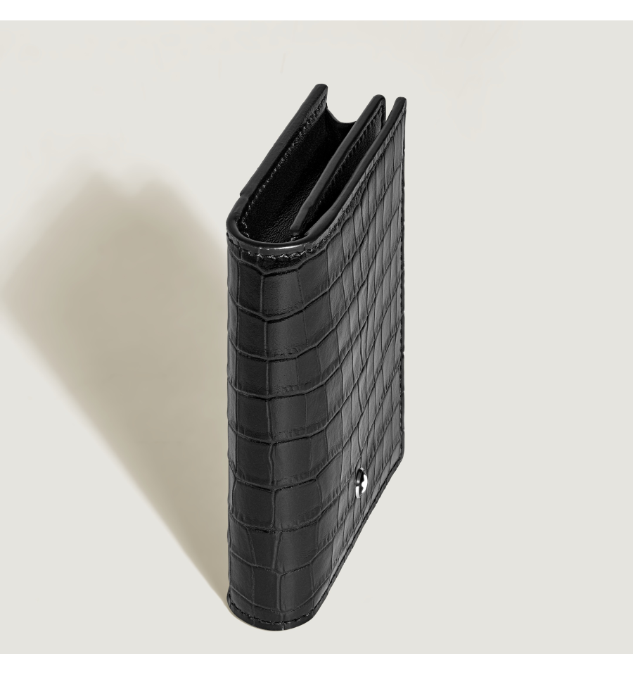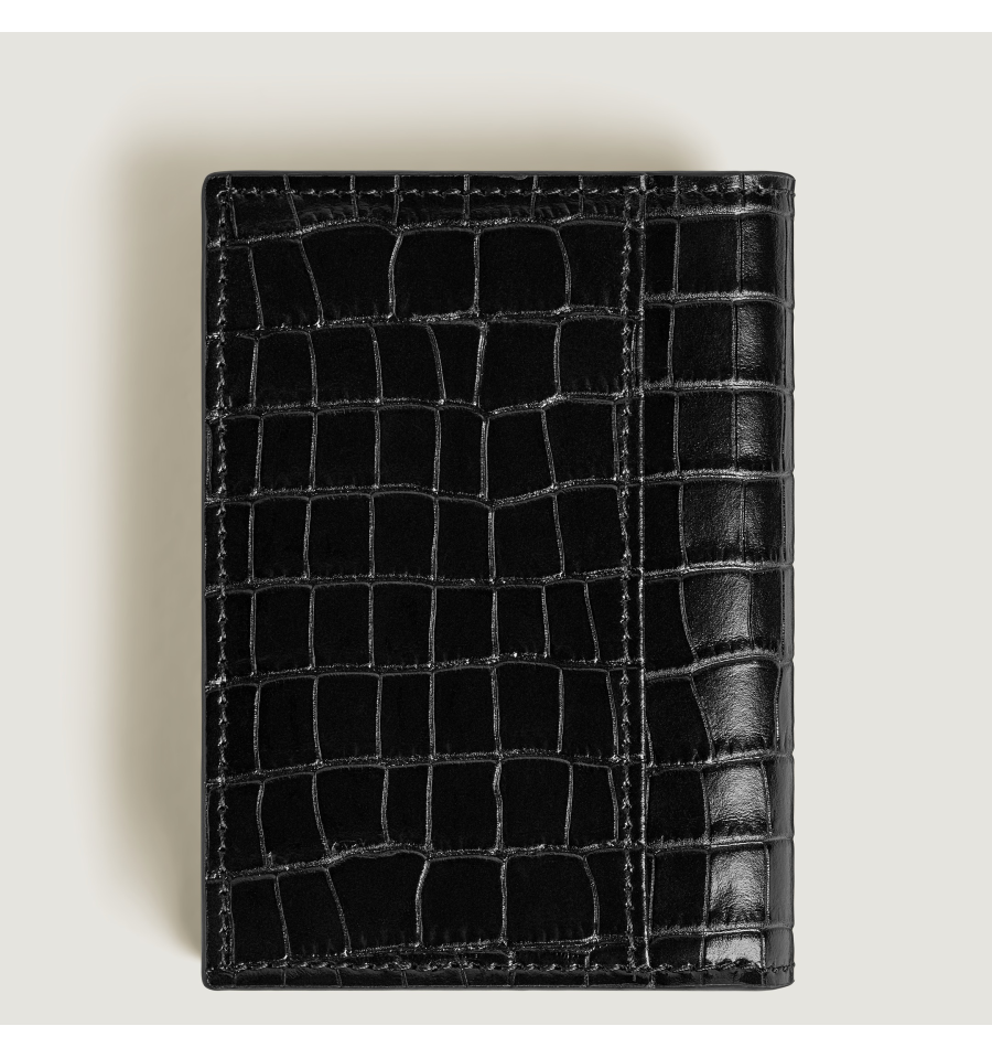 Rehaussez vos transactions quotidiennes avec ce porte-cartes, confectionné dans un cuir noir élégant imprimé crocodile pour un look audacieux et raffiné. L'extérieur est doté d'une fente pratique pour carte de crédit afin d'accéder rapidement à votre carte la plus utilisée, tandis que l'intérieur comprend trois fentes supplémentaires pour cartes de crédit, un compartiment dédié aux cartes de visite et une poche supplémentaire pour les reçus ou autres petits objets essentiels.