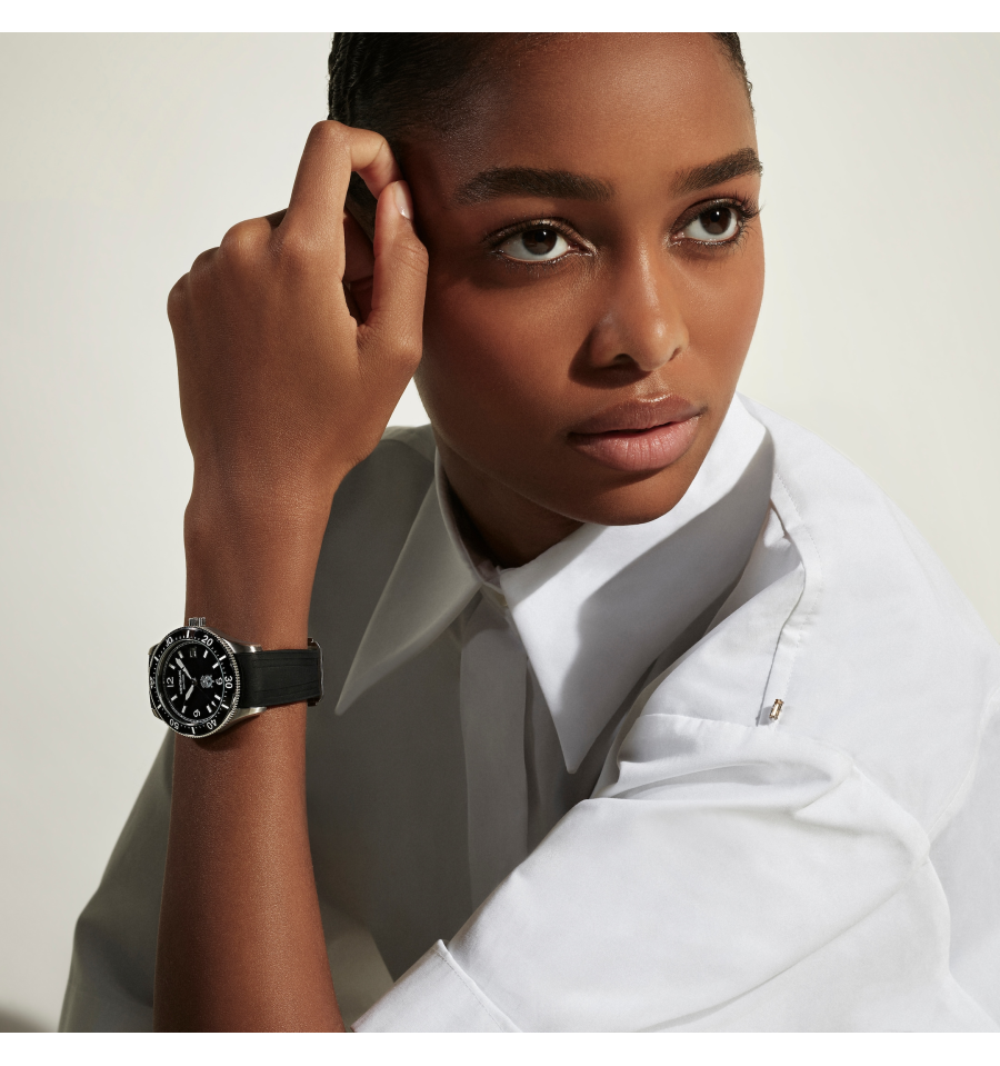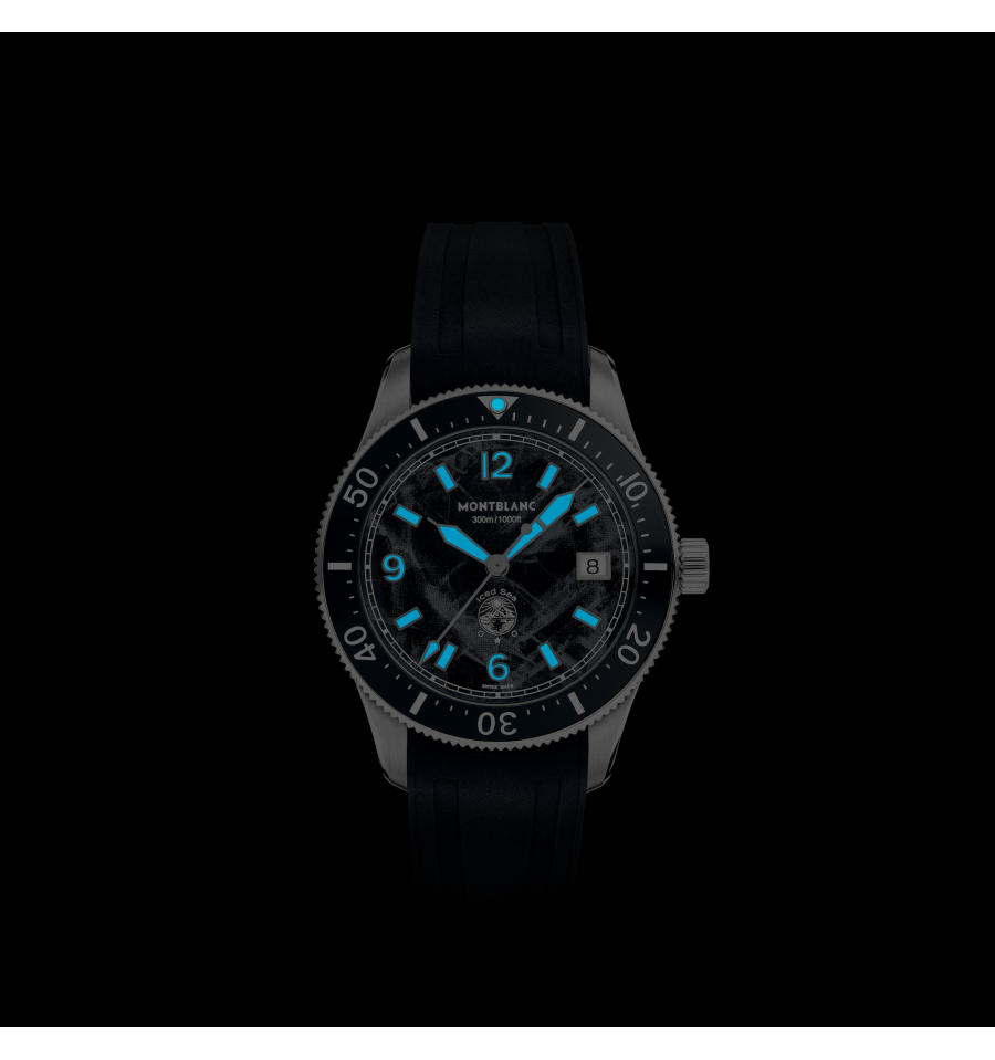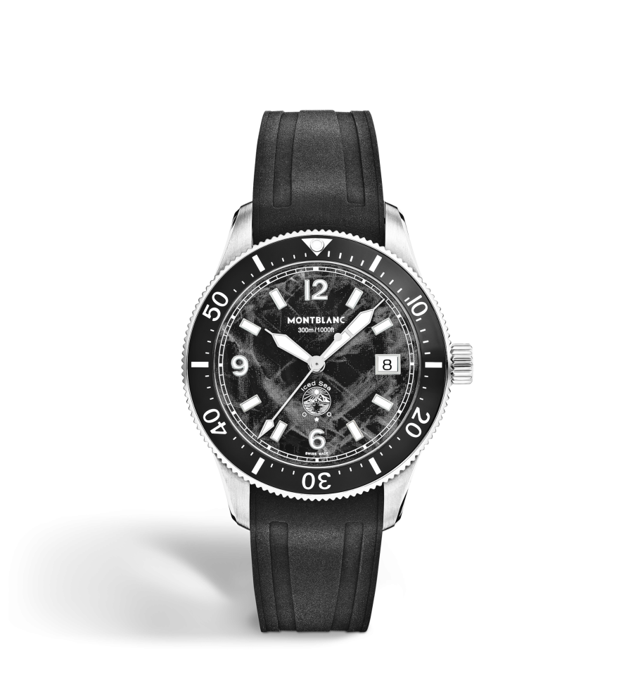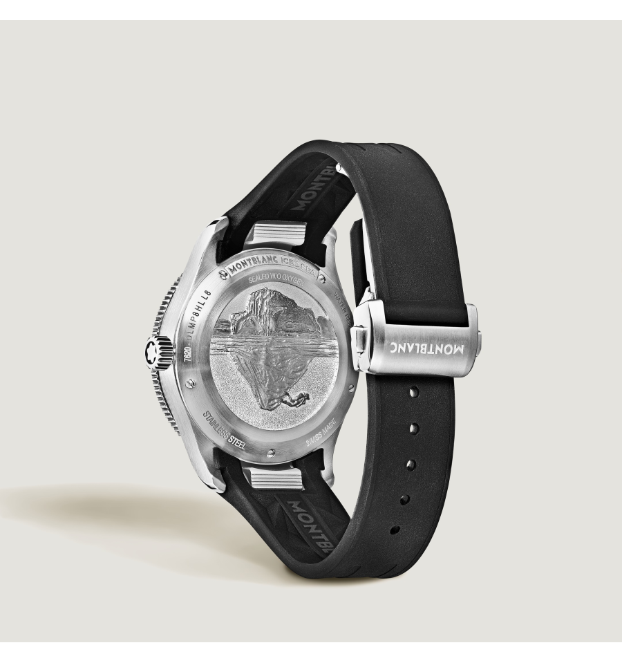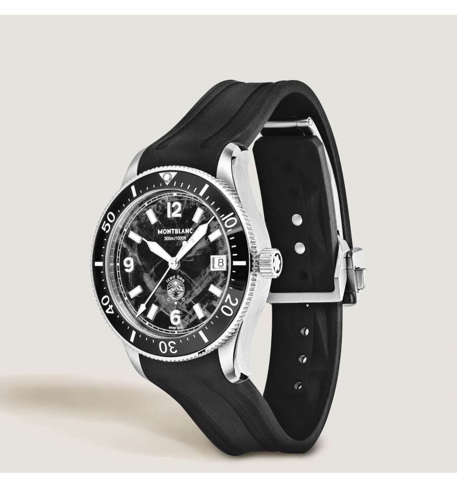 La Montblanc Iced Sea Automatic Date 0 Oxygen, avec son cadran noir à motif glaciaire, donne l'impression de regarder dans les profondeurs d'un glacier. Inspirée de la Mer de Glace, cette texture glaciale a été réalisée à l'aide d'une technique ancestrale presque oubliée appelée gratté-boisé. La montre est logée dans un boîtier de 38 mm en acier inoxydable totalement dépourvu d'oxygène et s'accompagne d'une lunette tournante unidirectionnelle avec insert en céramique noir, d'un fond de boîtier embossé et d'un bracelet interchangeable en caoutchouc noir avec système d'ajustement fin. Cette montre est conforme à la norme ISO 6425 pour la plongée sous-marine, et se caractérise par une étanchéité à 300 m.